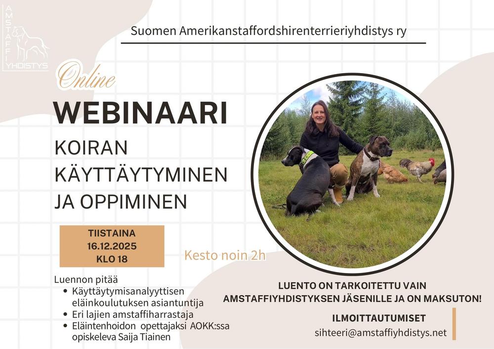 Onko sinulla upea kuva amstaffistasi? Nyt sinulla on mahdollisuus saada se osaksi Suomen Amerikanstaffordshirenterrieriyhdistys ry:n vuoden 2026 seinäkalenteria! Etsimme kalenteriin monipuolisia kuvia…